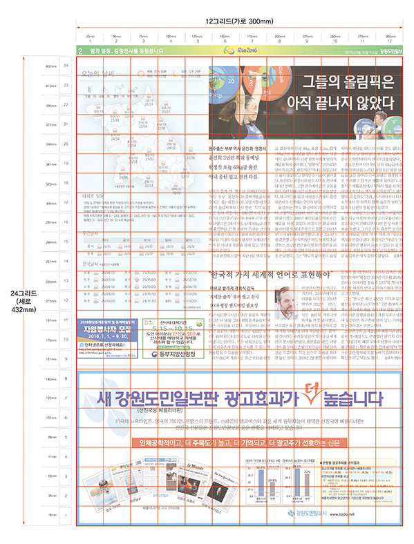 ▷신문광고 전면규격 - 가로 30cm(12그리드)와 세로 43.2cm(24그리드)