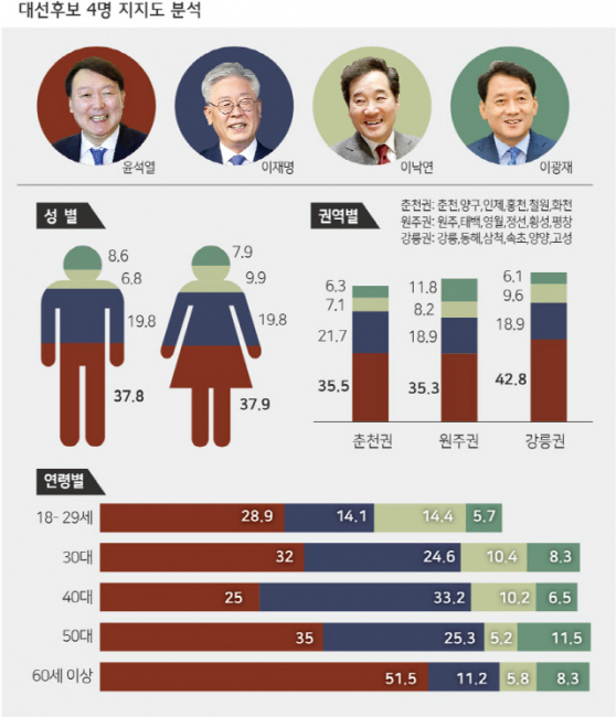 [강원도민일보 이승은 기자] 강릉 연고의 윤석열 전 검찰총장에 대한 도민들의 지지가 급등조짐을 보이고 있다.여권에서는 이재명 경기지사의 강세 속에 이낙연 전대표와 이광재 국회의원이 추격에 나섰다.출마선언을 준비 중인 최문순 지사는 답보상태를 보이고 있다.