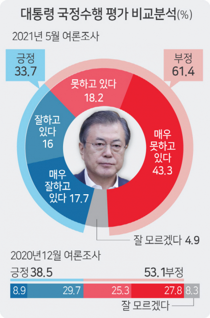 문 대통령에 대한 국정수행 평가는 부정평가가 61.4%로 긍정평가(33.7%)를 약 2배 가까이 상회한 것으로 나타났다.