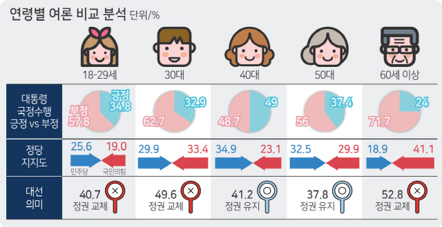 이번 여론조사 결과,‘대통령 국정 수행 평가’에 대해 만 18∼29세(57.8%)와 30대(62.7%) 응답자의 부정평가는 과반이 넘었다.정권교체론에도 만 18∼29세는 40.7%로 정권유지론(20.6%)을 두배 가까이 앞섰다.30대는 정권교체론이 49.6%(정권유지론 30.8%)나 차지했다.30대 이하의 도내 젊은 유권자들이 문재인 정부에 대해 강한 불만을 보이고 있는 셈이다.
