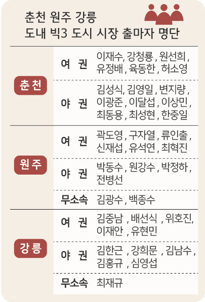 춘천·원주·강릉 도내 ‘빅3 도시’의 시장 선거에 도전하는 여야 진영의 경쟁이 치열하다.