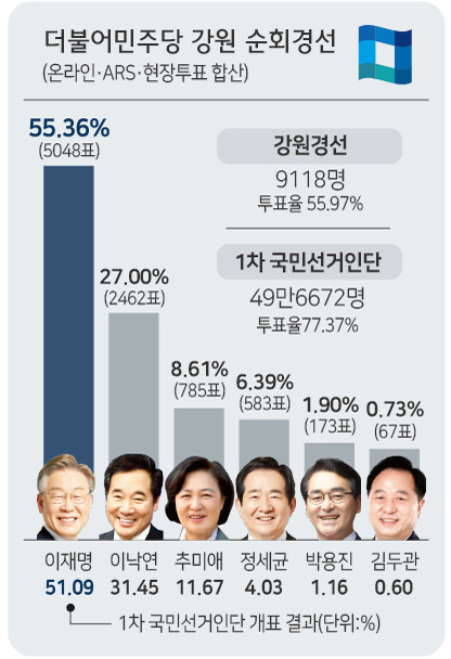 이 후보는 이날 함께 공개된 국민·일반당원 1차 선거인단 투표에서도 51.09%를 얻어 1위에 올랐다.이낙연 후보는 강원경선은 27%,1차 국민선거인단은 31.45% 득표를 각각 기록,2위를 유지했다.민주당 대선후보 선출을 위한 강원 지역 순회경선 합동연설회가 이날 오후 원주 오크밸리리조트에서 열린 가운데 강원경선 1위는 이재명 후보가 차지했다.강원경선에서 승리하면서 이 후보는 △대전·충남(54.81%) △세종·충북(54.54%)△대구·경북(51.12%)에 이어 4연속 과반 득표에 성공했다.이재명 후보는 대의원·권리당원·ARS신청 선거인단 등을 합산한 최종 결과,55.36%(5048표)를 기록해 27%(2462표)를 득표한 이낙연 후보와 약 2배 격차를 벌렸다.3위는 추미애 후보(8.61%·785표)였으며 △정세균 후보 6.39%(583표)△박용진 후보 1.90%(173표)△김두관 후보 0.73%(67표)순이었다.강원경선 투표율은 55.97%(9118명)였다.