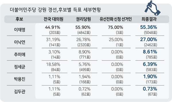 강원을 포함해 지역순회 경선 4개 지역과 1차 선거인단 투표 결과,1위 이재명 후보,2위 이낙연 후보의 순위가 그대로 이어지는 흐름을 보이고 있다.