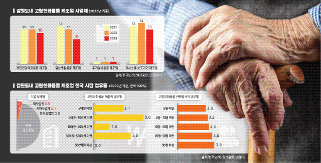 강원도는 17개 시도 가운데 전국 3위에 해당하는 고령화 지역임에도 불구하고 전국 고령친화 제조업체 중 강원기업 비율은 3.1%에 불과, 고령화 속도에 비해 산업 대응은 매우 더딘 실정이다.