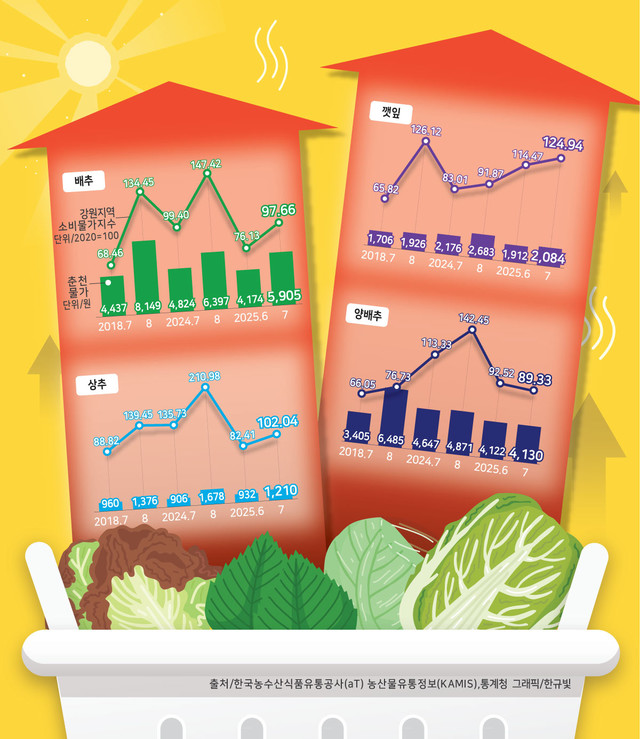 통계청 소비자물가지수(2020=100 기준)에 따르면 폭염이 기승을 부렸던 2018년과 2024년, 그리고 올해(2025년)에도 강원도 주요 채소류 가격은 극심한 등락을 보였다. 배추는 2018년 7월 68.46에서 8월 134.45로 두 배 가까이 치솟았고, 2024년에도 7월 99.40에서 8월 147.42로 급등했다. 올해 6월에도 76.13를 기록, 7월에는 97.66으로 상승세를 보였다.