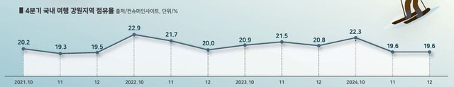 최근 4년간 4분기(10~12월) 국내여행에서 강원지역의 점유율은 평균 20% 내외를 꾸준히 유지하고 있는 것으로 나타났다.